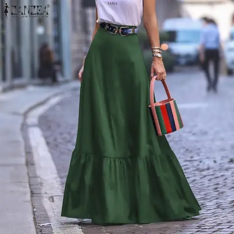ZANZEA Bohemian Women Skirts 2021 Summer Ruffle Patchwork Maxi Skirts Casual Solid Ladies Zipper A-line Bottoms Plus Size 5XL