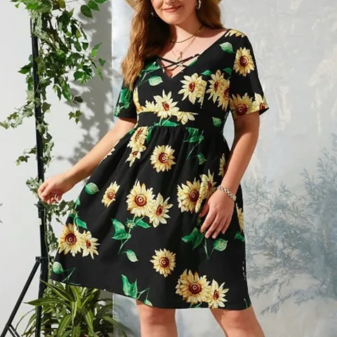 Women's Vintage Dress V-neck Women's Casual Sunflower High Waist Short Sleeve Crossovers Plus Size Dress Vestido Mujer 2021