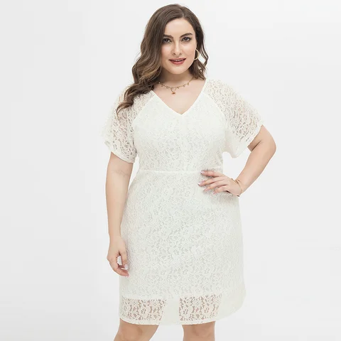Plus Size Lace Dress With V Neck Back Design White Big Size Office Dresses Short Sleeve Loose Midi Dress Work Casual Wear