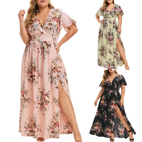 Women Plus Size V-neck Dresses Ladies plus size Summer Short Sleeve Dress Female oversize Boho Floral Print Split Dress vestidos