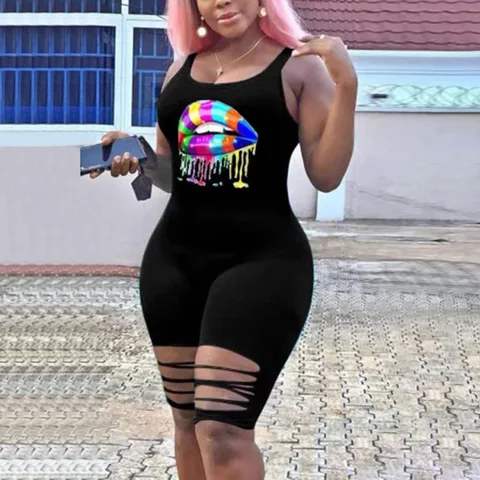 Umeko 2020 Ladies Summer Vogue Lips Printed Sleeveless Rompers Fashion Plus Size Slim Fit Soft One Piece Short Jumpsuit Overalls