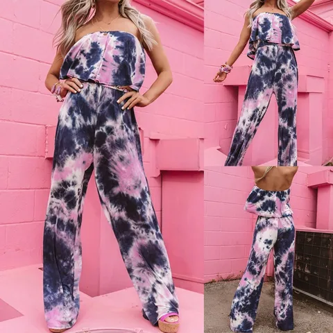 Fashion Womens Casual Loose sexy Sleeveless Tube Top Printed Tie-dye Jumpsuit Wide leg pants Rompers Plus Women's tracksuit F1