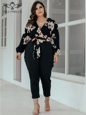 JollyHolla 2020 Women Plus Size Patchwork Long Sleeve Flower Print V-Neck Sashes Romper Female Loose Drawstring Calf-Length Pant