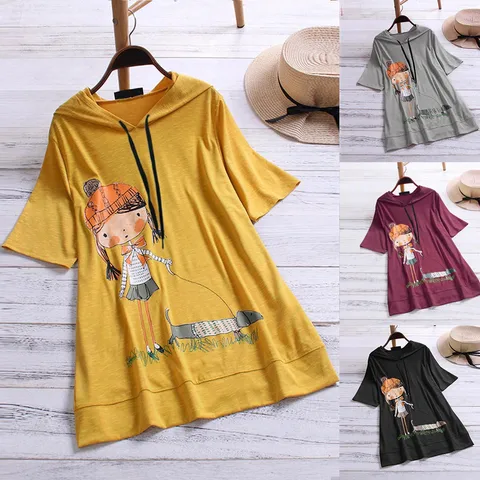 Plus Size Tops For Women 2021 Fashion Casual Cartoon Print Blouses Casual Top Hooded Short Sleeve Shirt Plus Size Blouse Bluzki