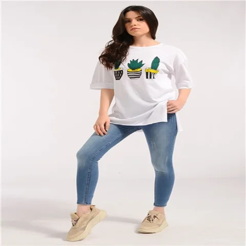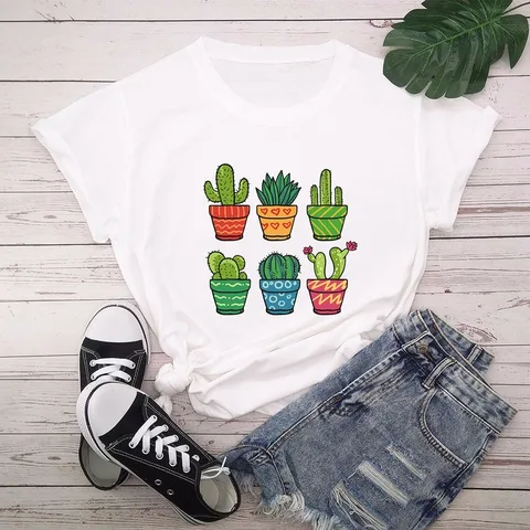 Summer Cotton Women T Shirt S-5XL Plus Size Cute Cactus Plants Print Short Sleeve Women Tees Tops Casual O-Neck Female tShirts