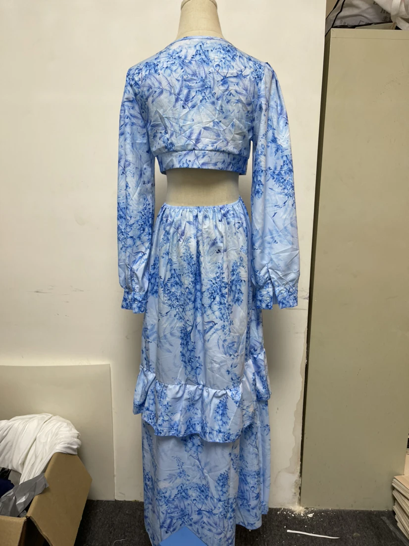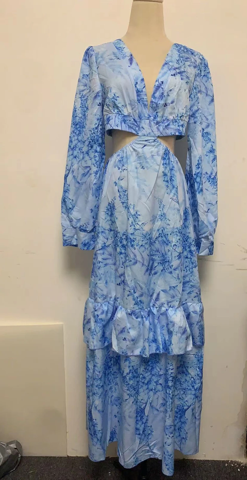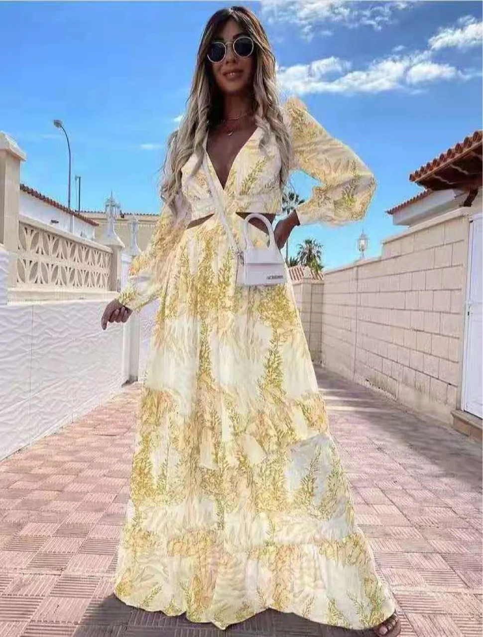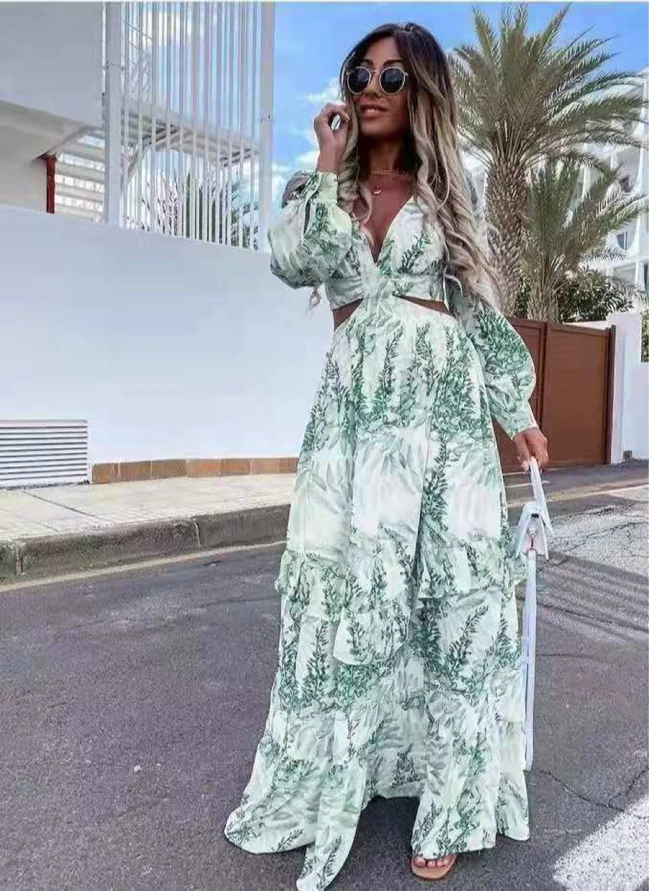 Beach Long Dress Sexy Hollow Out Boho Deep V Neck Dress Women 2021 Spring Plus Size Print Ruffle Party Long Sleeve Maxi Dresses