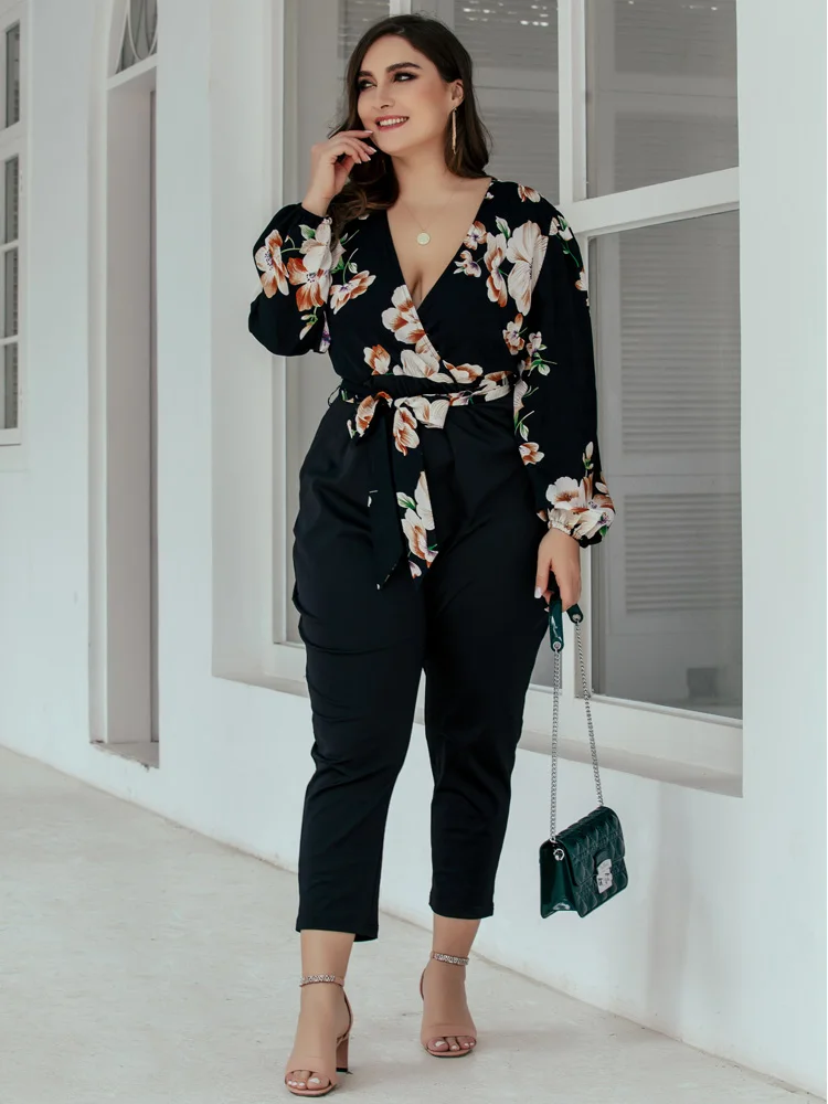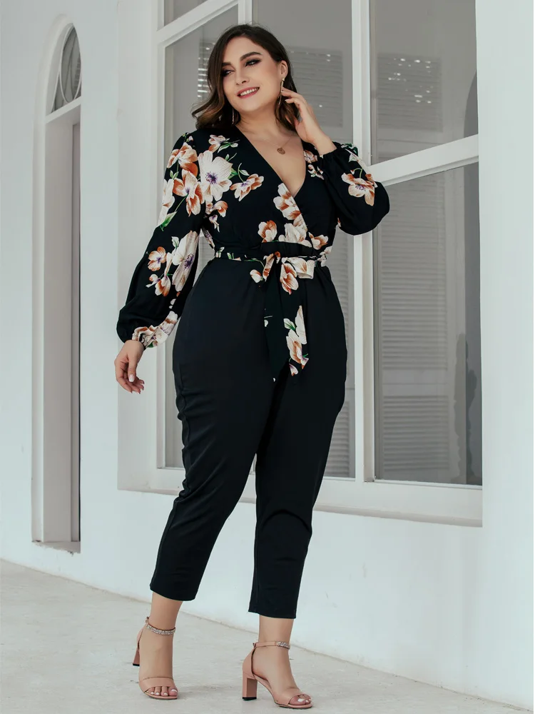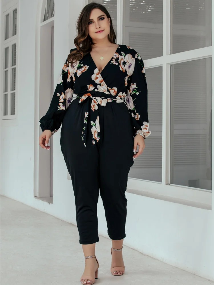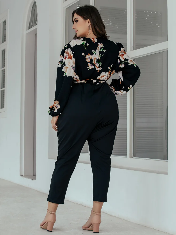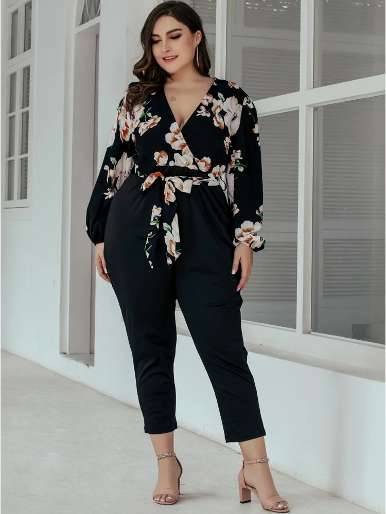 JollyHolla 2020 Women Plus Size Patchwork Long Sleeve Flower Print V-Neck Sashes Romper Female Loose Drawstring Calf-Length Pant